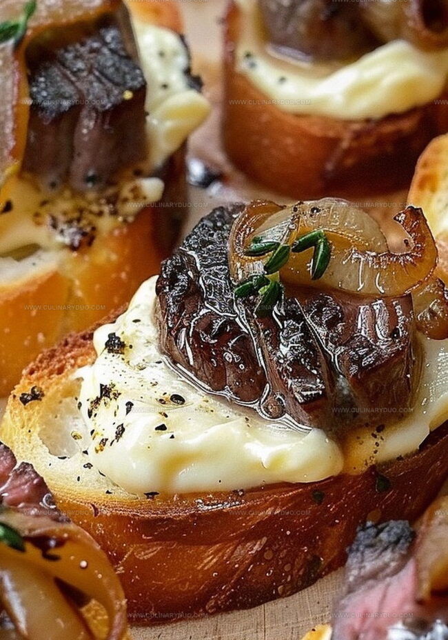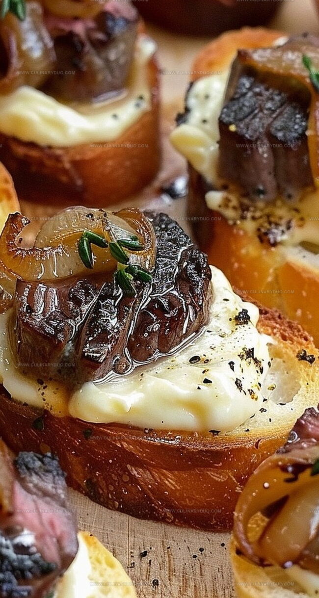 - Layer each crostini with a generous spread of the chilled horseradish sauce, top with tender steak strips, and crown with the caramelized shallots.