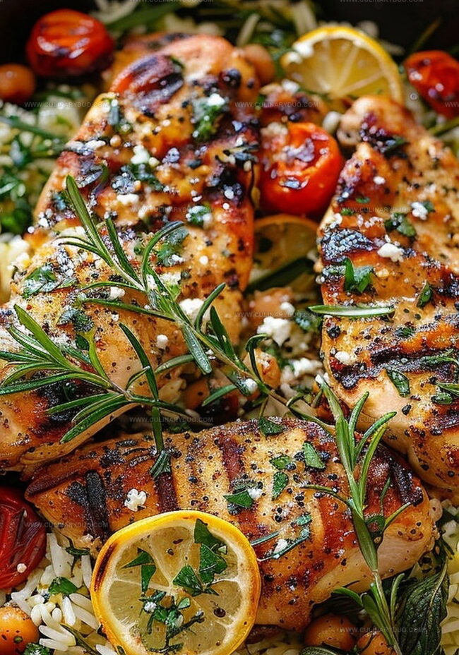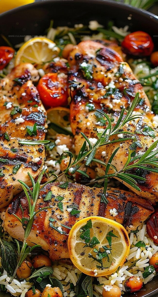 - Arrange cooked chicken atop the rice, drizzle with remaining feta mixture, and garnish with fresh oregano leaves for a vibrant finish.