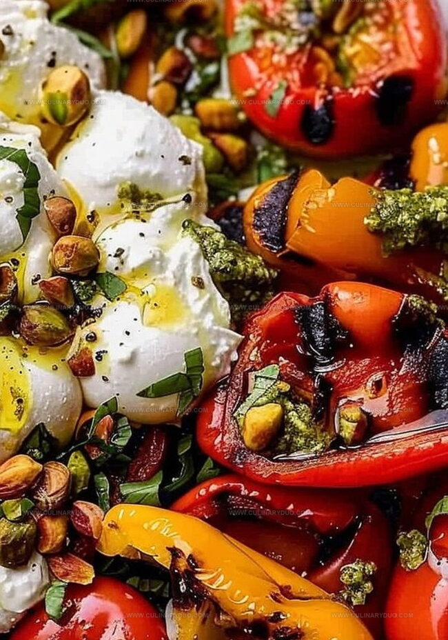 Colorful grilled bell peppers with burrata create a Mediterranean masterpiece that dances between smoky char and creamy richness. Crisp peppers nestled with luxurious cheese promise a sensory journey you’ll savor with each delectable bite.
