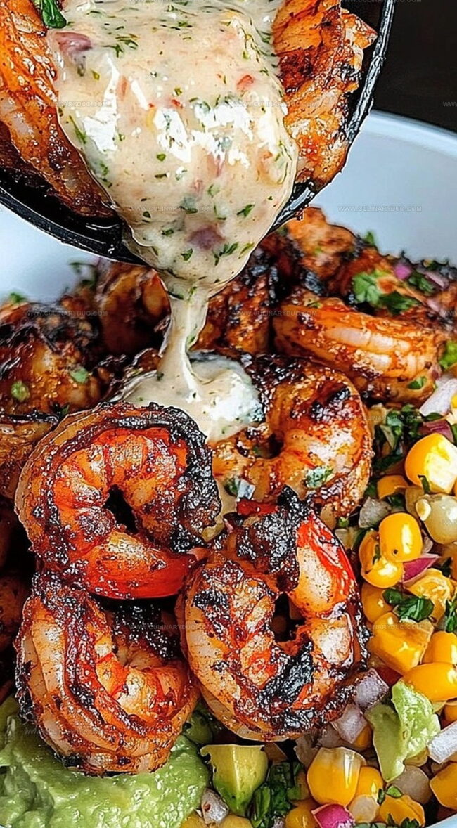 Grilled Shrimp Bowl with Avocado, Corn Salsa & Creamy Garlic Sauce Recipe