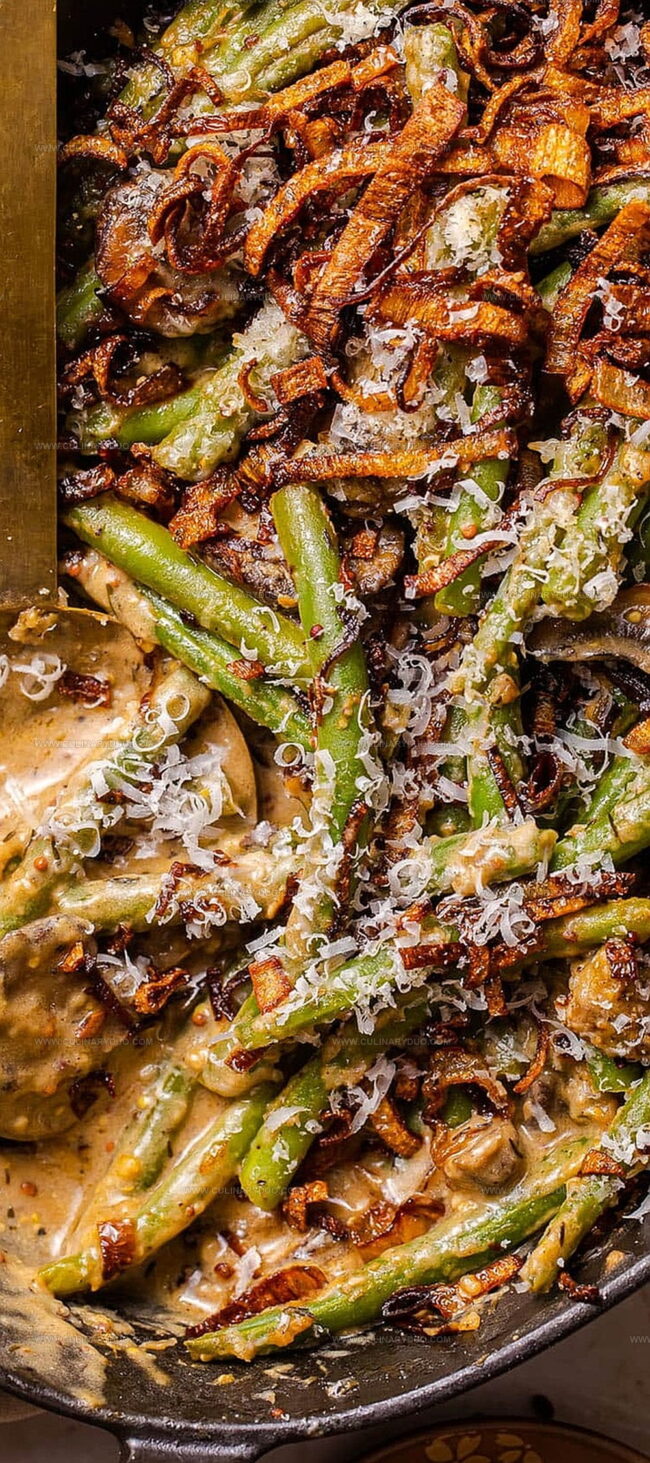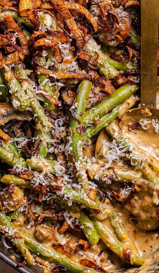 - Transfer blanched green beans to casserole dish, coating completely with creamy mushroom sauce.