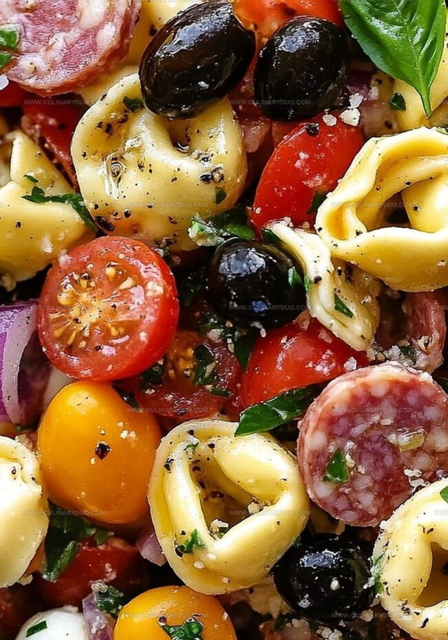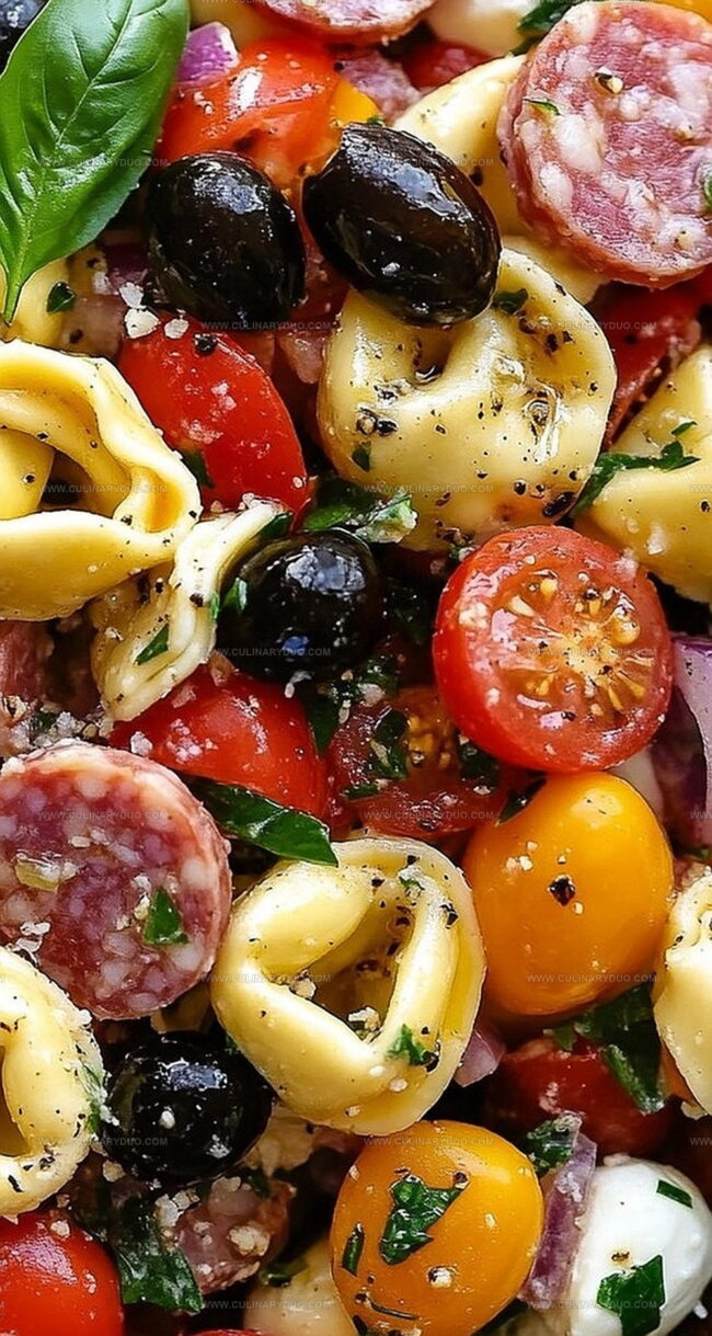 - Select a spacious mixing bowl and combine cooled tortellini with cubed salami, halved cherry tomatoes, diced bell peppers, sliced black olives, mozzarella pearls, fresh basil ribbons, and thinly sliced red onion.