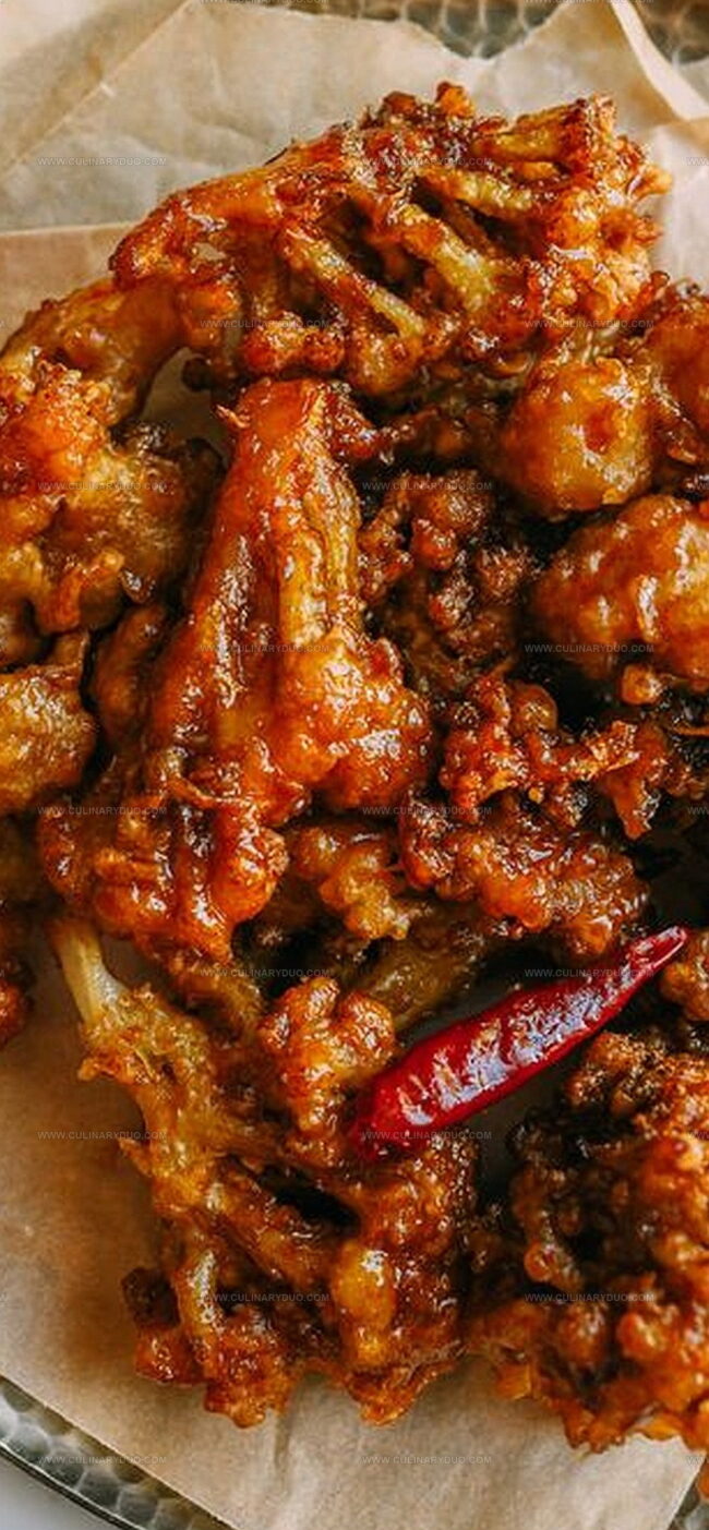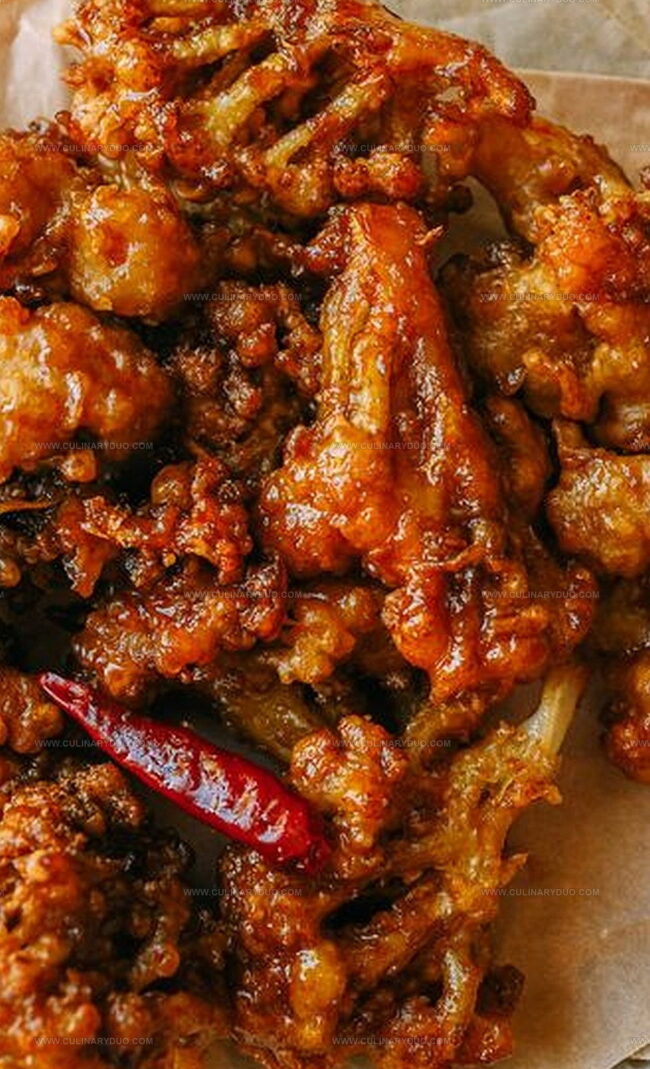 - Generously coat freshly fried cauliflower with prepared sauce in a large bowl, ensuring even distribution before immediate serving.