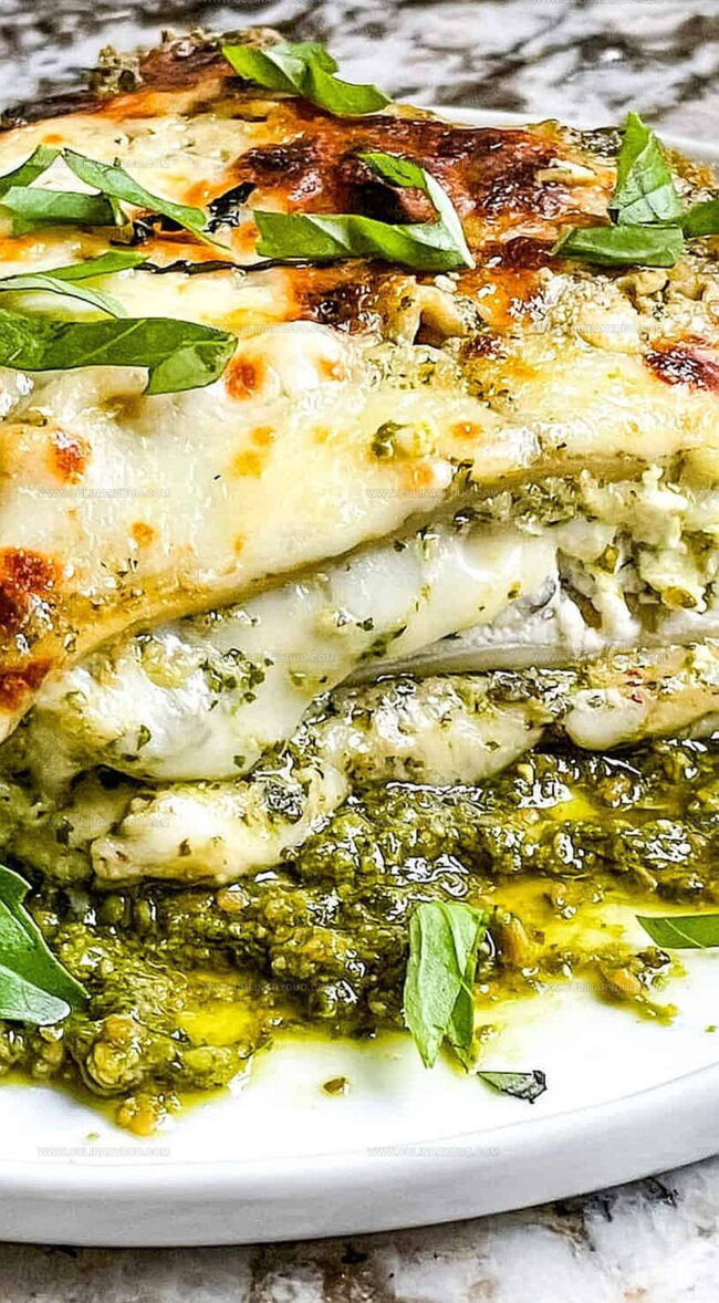 Layered Italian Classic pesto lasagna blends Ligurian herbs with creamy cheeses for a Mediterranean masterpiece. Silky pasta sheets and rich verde sauce create a comforting plate you’ll savor with pure Mediterranean delight.