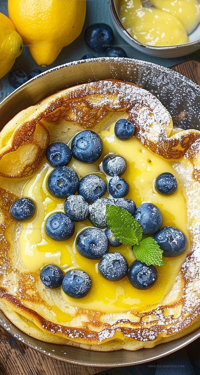 Rich, golden Dutch baby pancake embraces zesty lemon curd and sweet blueberries in one spectacular breakfast delight. Skillet-baked perfection offers a luxurious morning experience you won’t forget.