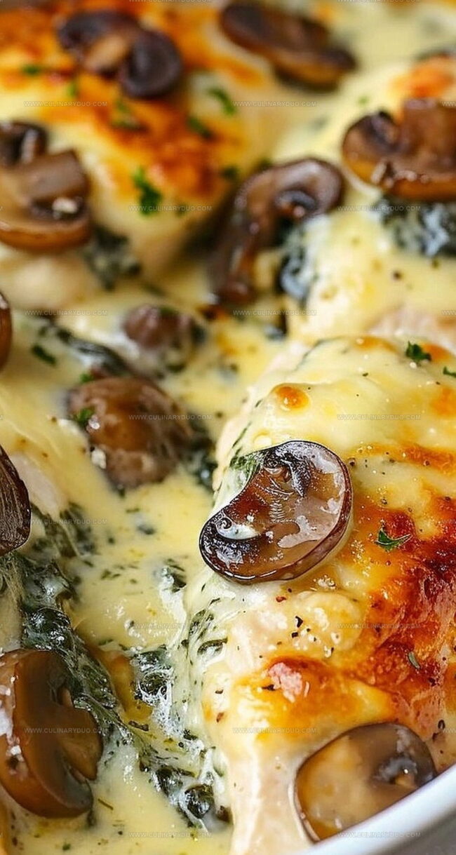 - Preheat oven to 350°F. Arrange chicken breasts in a 13 x 9-inch baking dish, layering with sautéed mushrooms and creamed spinach.