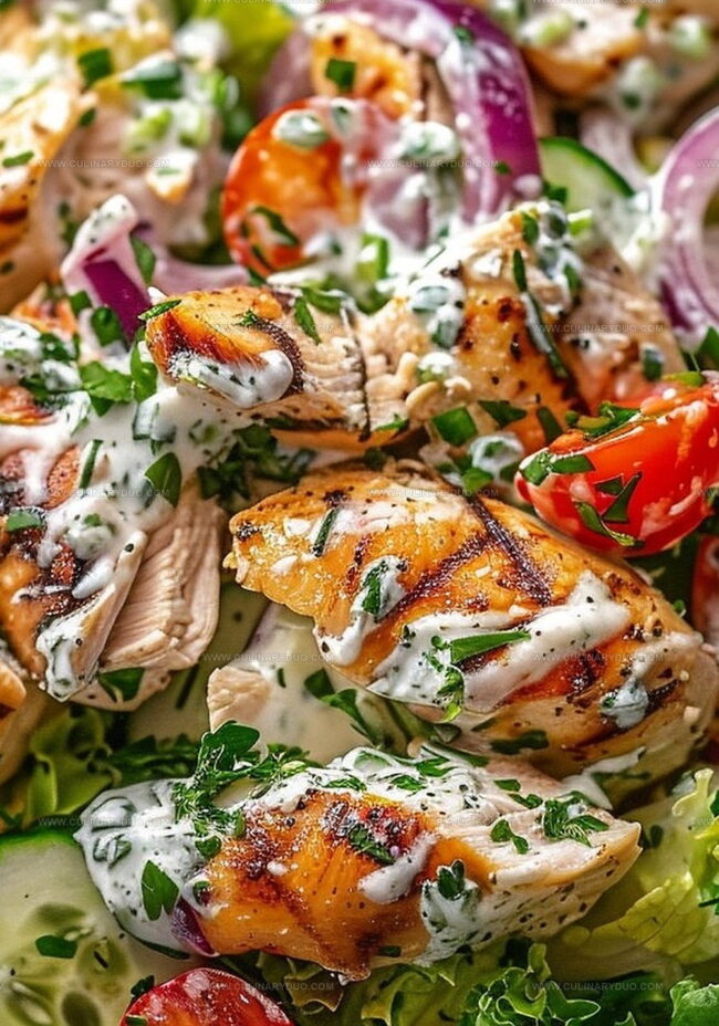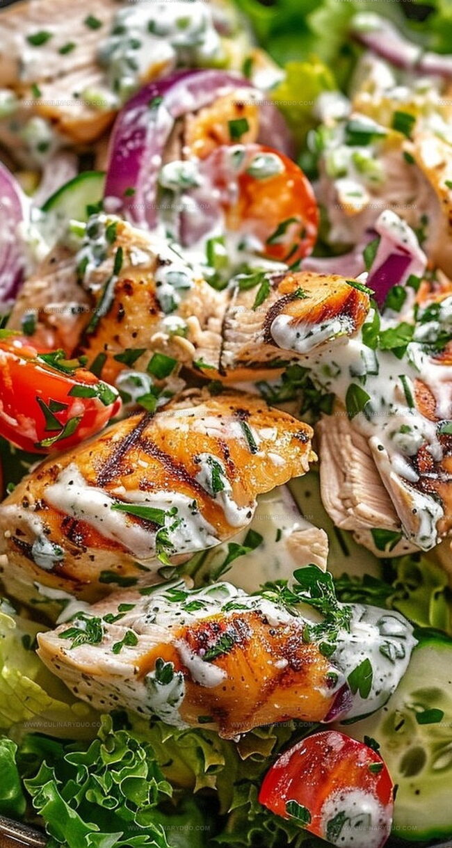 Generously spoon the creamy tzatziki sauce over the chicken and salad, allowing the rich, herbal sauce to cascade through the ingredients and infuse every bite with Mediterranean charm.