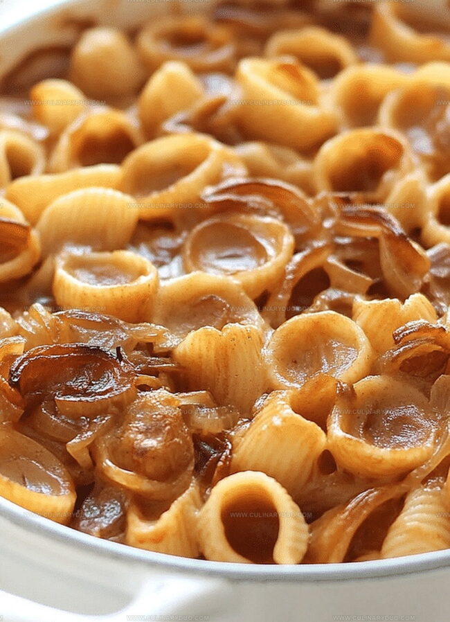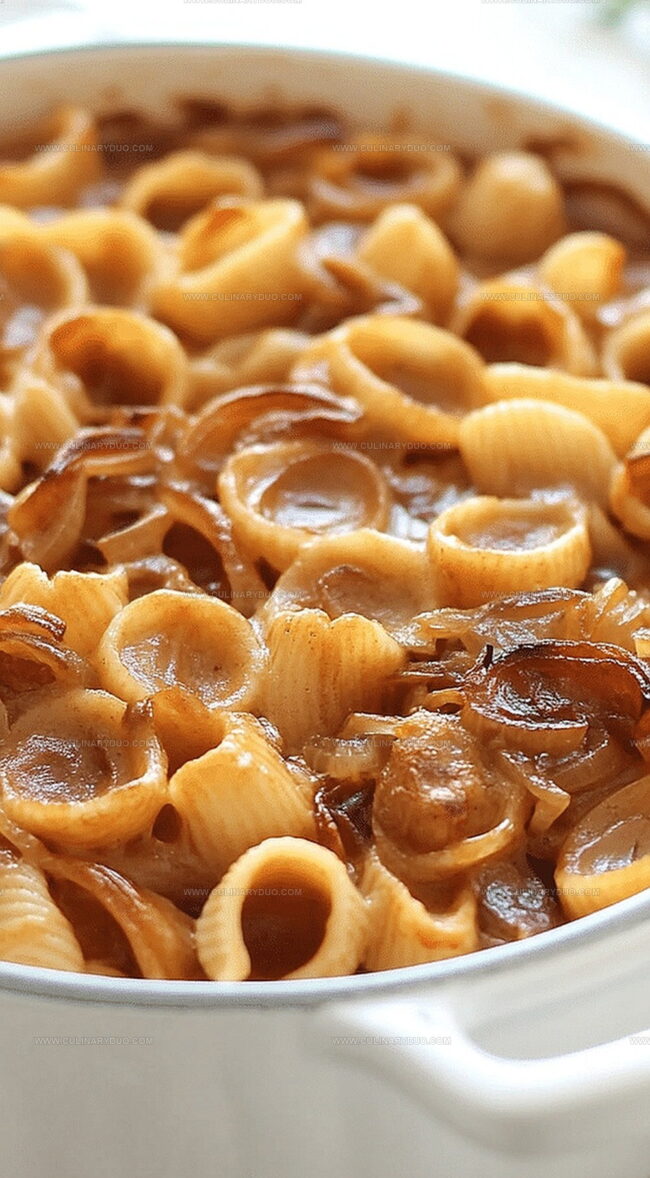 Rich caramelized onions mingle seamlessly with tender pasta, creating a dish that sings with rustic European charm.