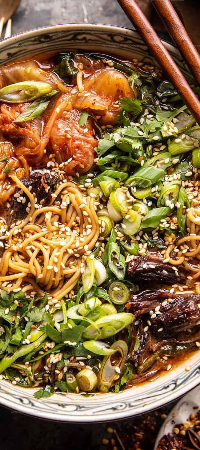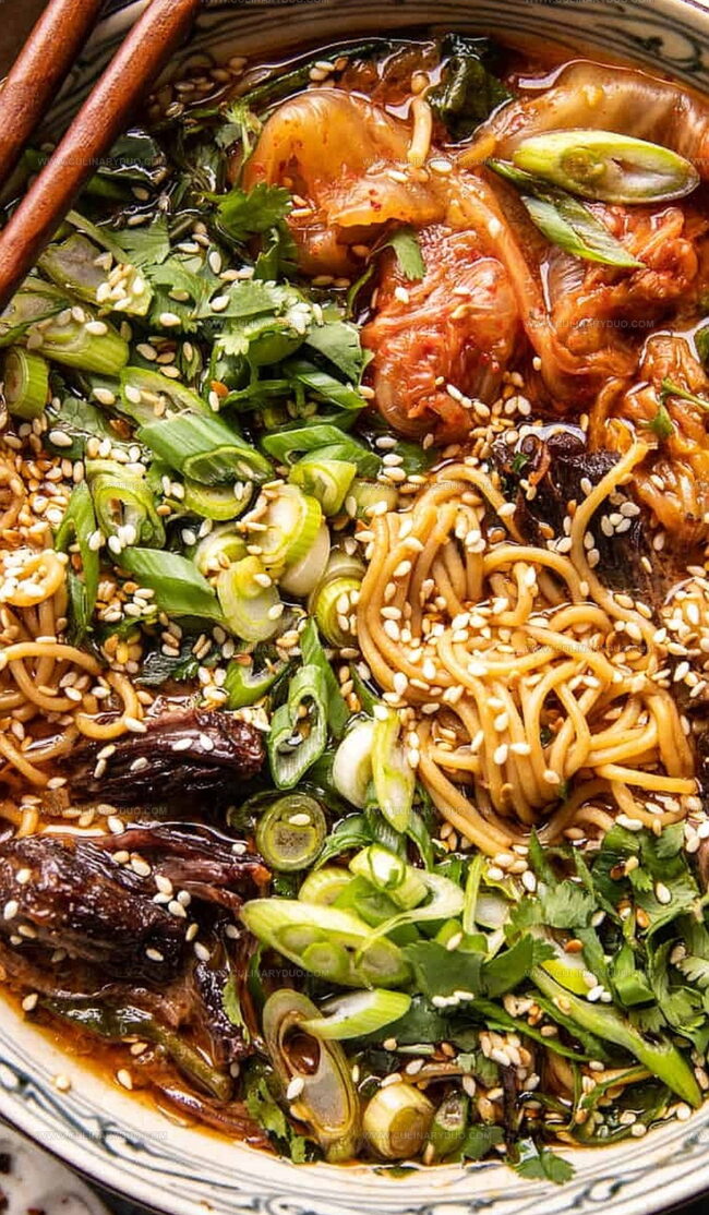 - Garnish generously with kimchi, fresh cilantro, sliced green onions, drizzle of chili oil, and sprinkle of sesame seeds.