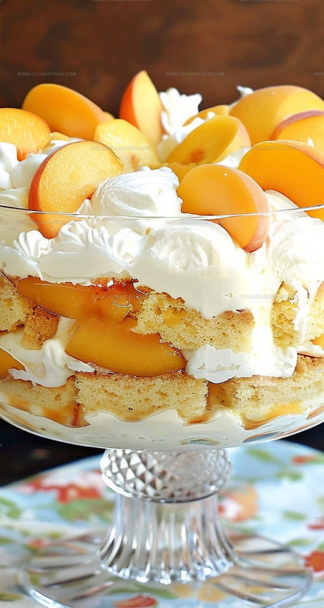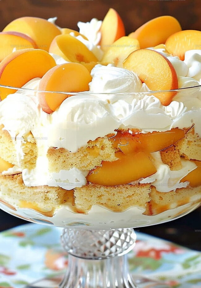 - Construct trifle by layering whipped cream, cake cubes, and peaches in a decorative glass bowl. Alternate layers, culminating with a crown of whipped cream and artistic peach slice garnish.