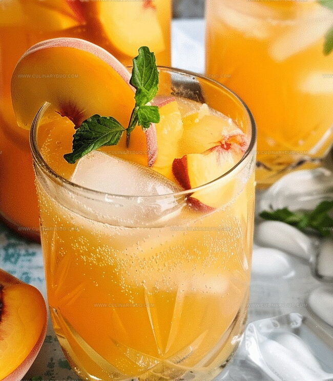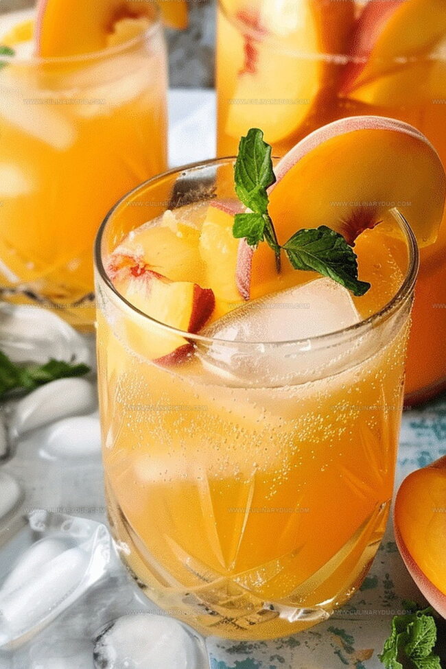 - When ready to serve, fill glasses with ice cubes and pour the refreshing peach lemonade, then artfully garnish with delicate lemon slices, succulent fresh peach wedges, and sprigs of vibrant mint for an elegant presentation.
