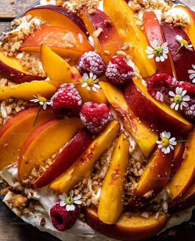 - When ready to serve, arrange peach slices over the cream. Garnish with fresh raspberries and reserved pretzel crumbs. Drizzle with remaining honey sauce.