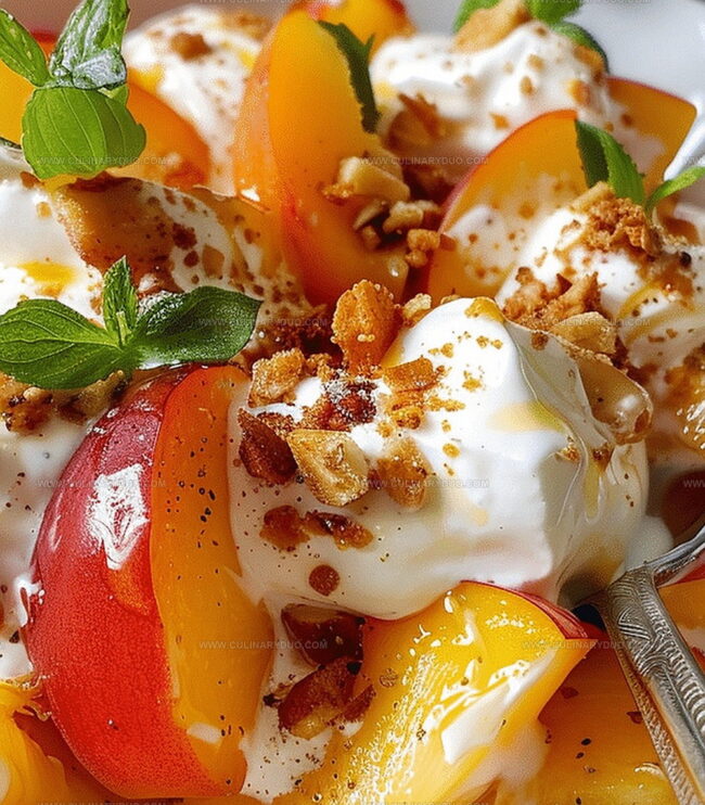 - Delicately fold in freshly diced peaches, ensuring even distribution throughout the creamy base while preserving the fruit’s structural integrity.