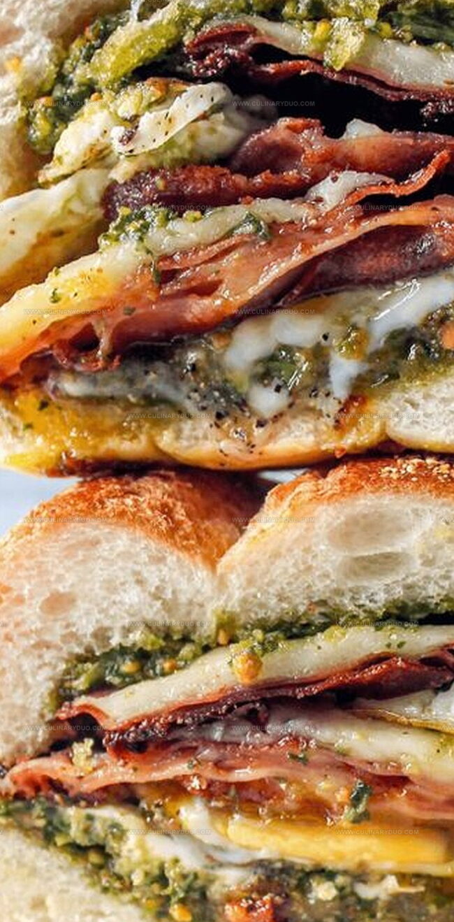 Pesto Eggs and Crispy Mortadella Sandwich elevates breakfast with Italian-inspired flair. Mediterranean flavors dance between crusty bread, promising a luxurious morning experience you won’t forget.