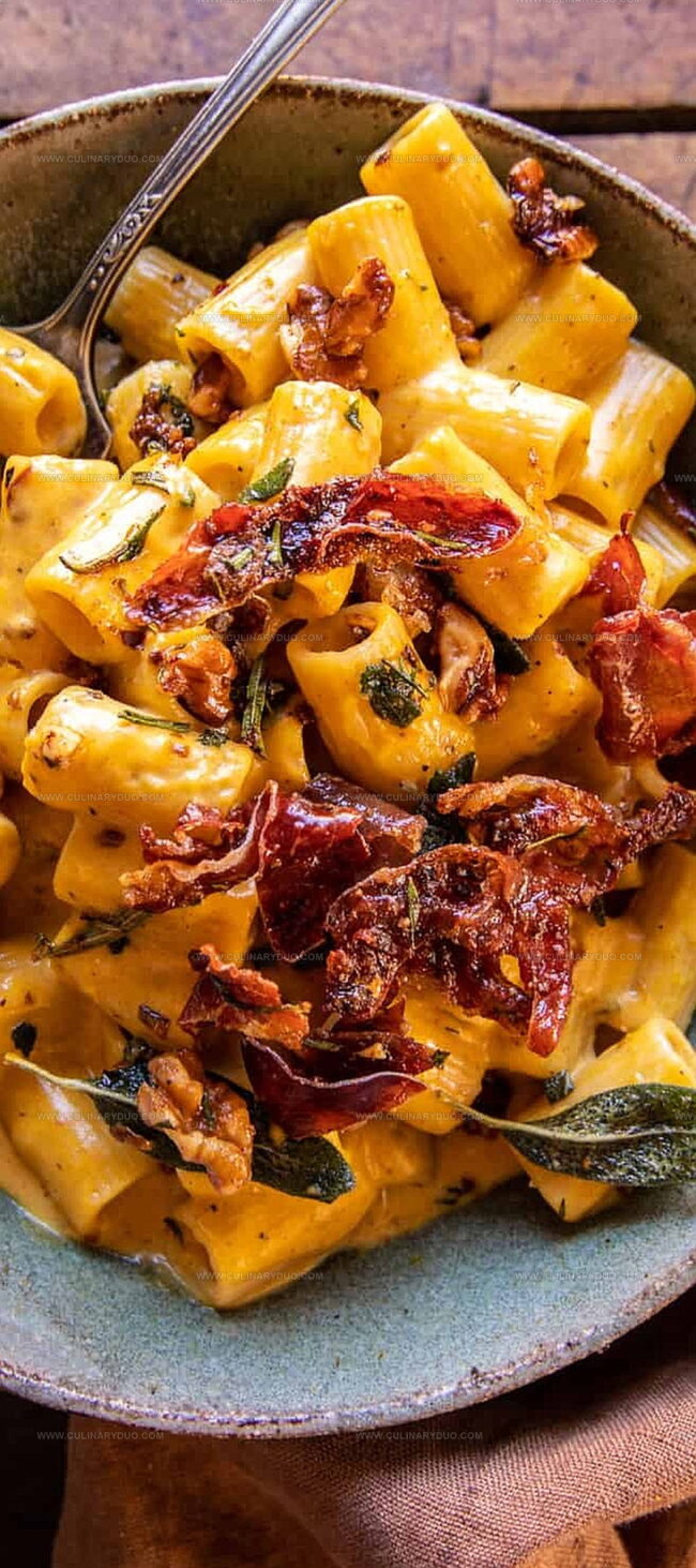 Rigatoni works best because its ridges and large tubes hold the creamy pumpkin sauce perfectly. However, you can substitute with penne or ziti if rigatoni is unavailable.