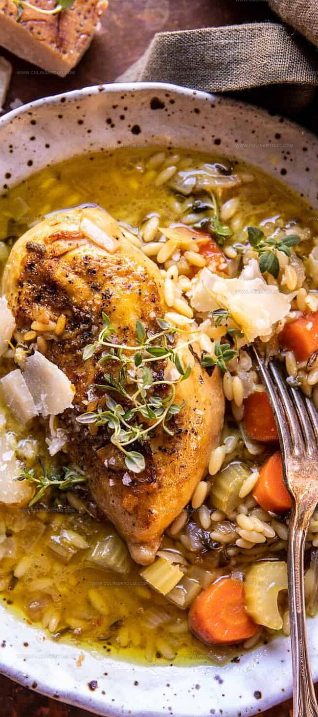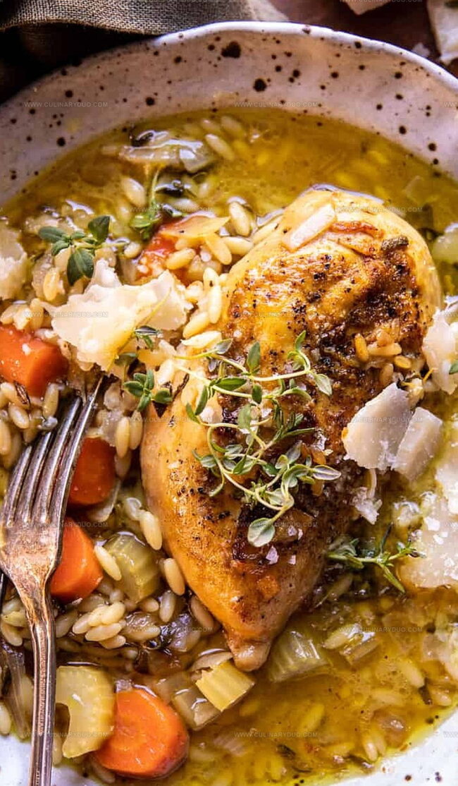 - Plate the roasted chicken atop the creamy orzo and fragrant broth. Garnish with freshly grated parmesan and delicate herb sprigs like thyme or parsley.