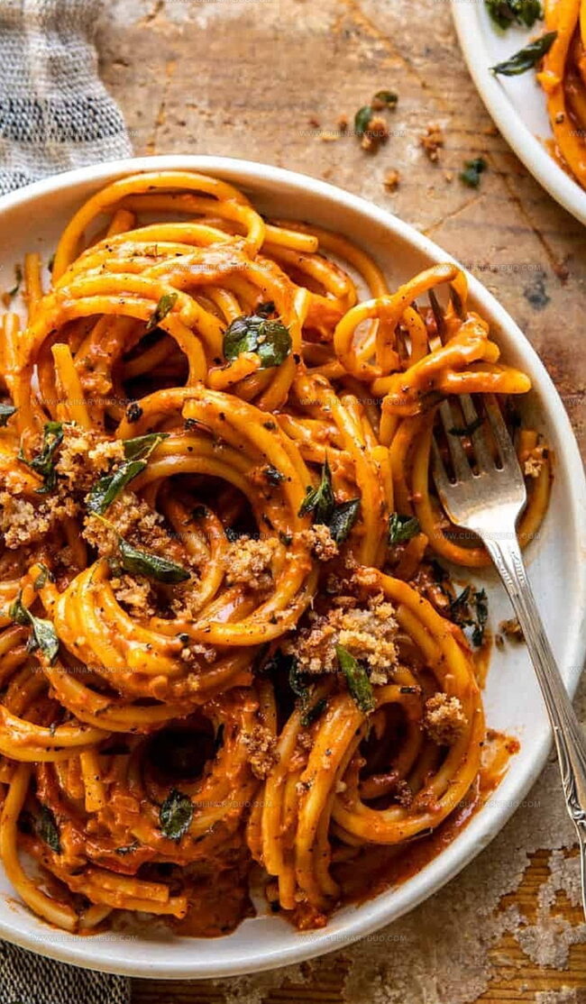 Silky roasted red pepper alla vodka pasta delivers creamy, rich comfort with a zesty Italian-inspired twist. Crispy oregano breadcrumbs crown this luxurious dish, inviting you to savor each indulgent bite of pasta perfection.