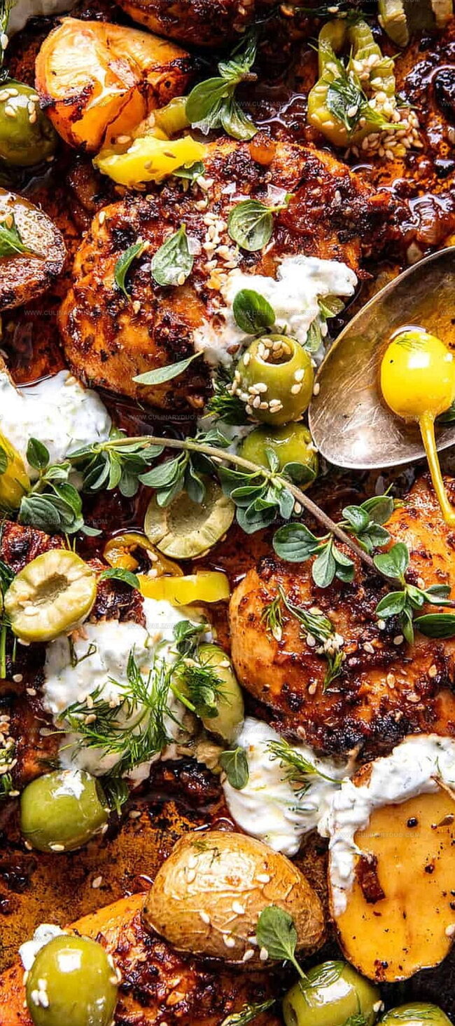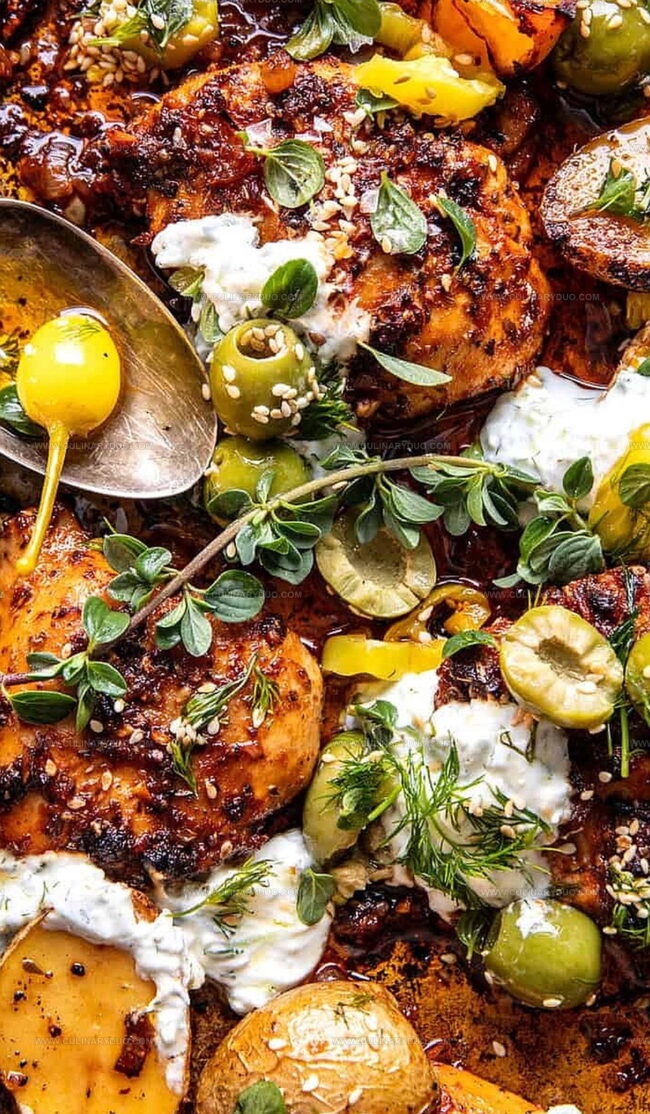 - While chicken roasts, prepare a vibrant herb topping by combining olive oil, fresh lemon juice, chopped herbs, sliced pepperoncini, kalamata olives, and toasted sesame seeds.