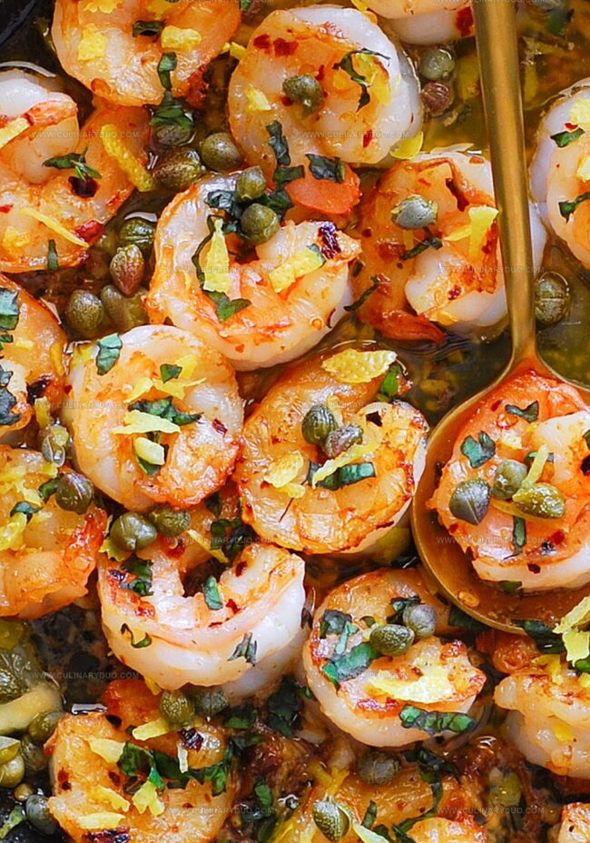 Briny capers burst with intense flavor against tender, garlic-kissed prawns.