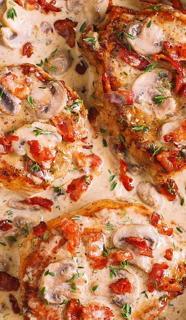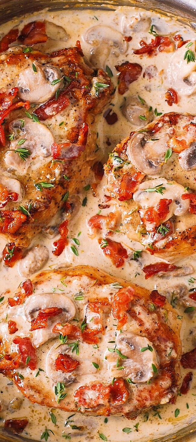Succulent smothered pork chops with a rich bacon and mushroom cream sauce promise a comforting meal that melts in your mouth.