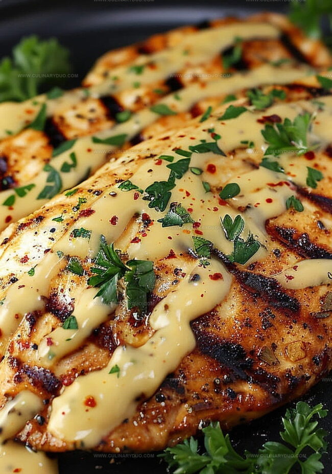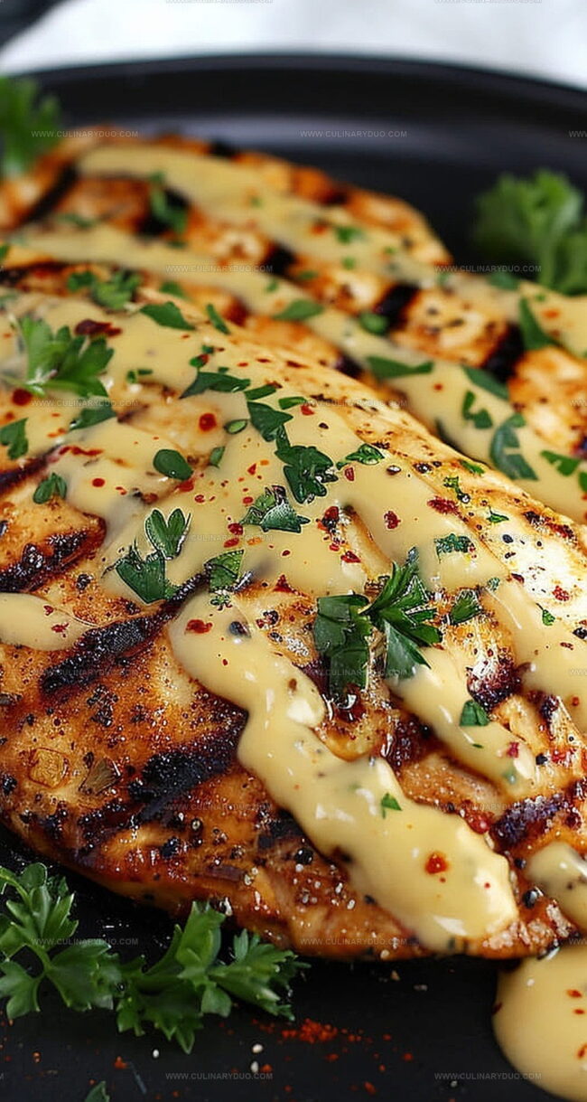 - Drizzle the warm, velvety cheese sauce directly over the spice-crusted grilled chicken before serving.