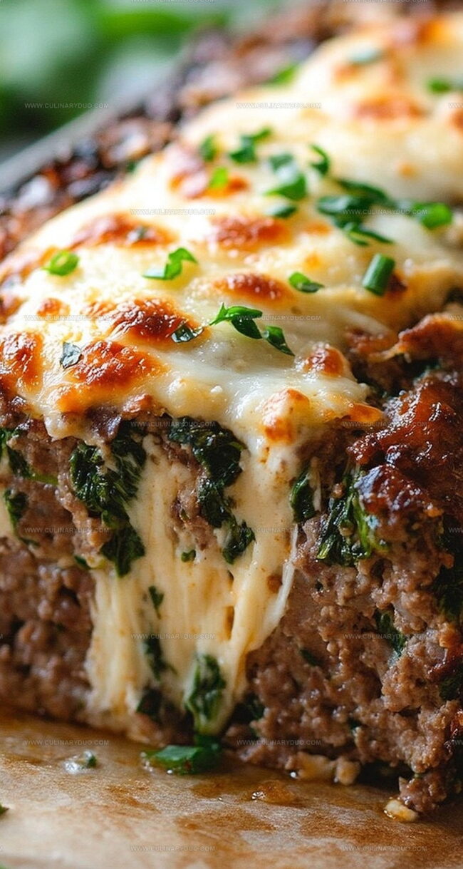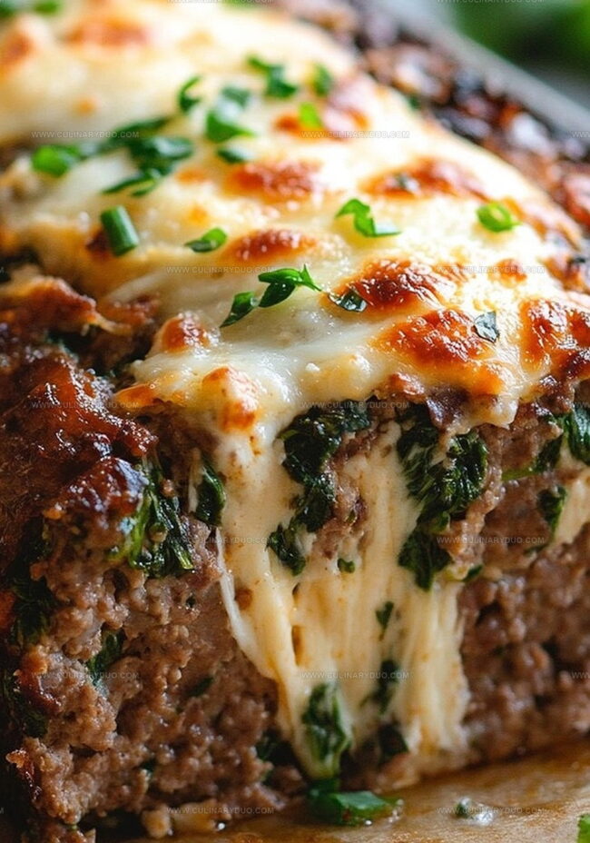 Savory spinach and mozzarella meatloaf brings Italian-inspired comfort to dinner tables with its cheesy, herbal goodness. Cheese-stuffed meat creates a delightful main course that satisfies hunger and delights palates with each flavorful slice.