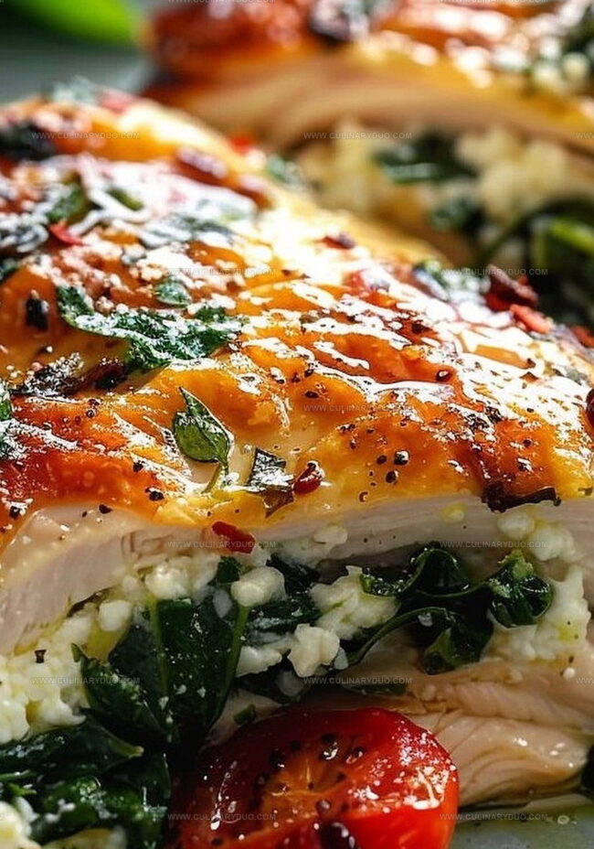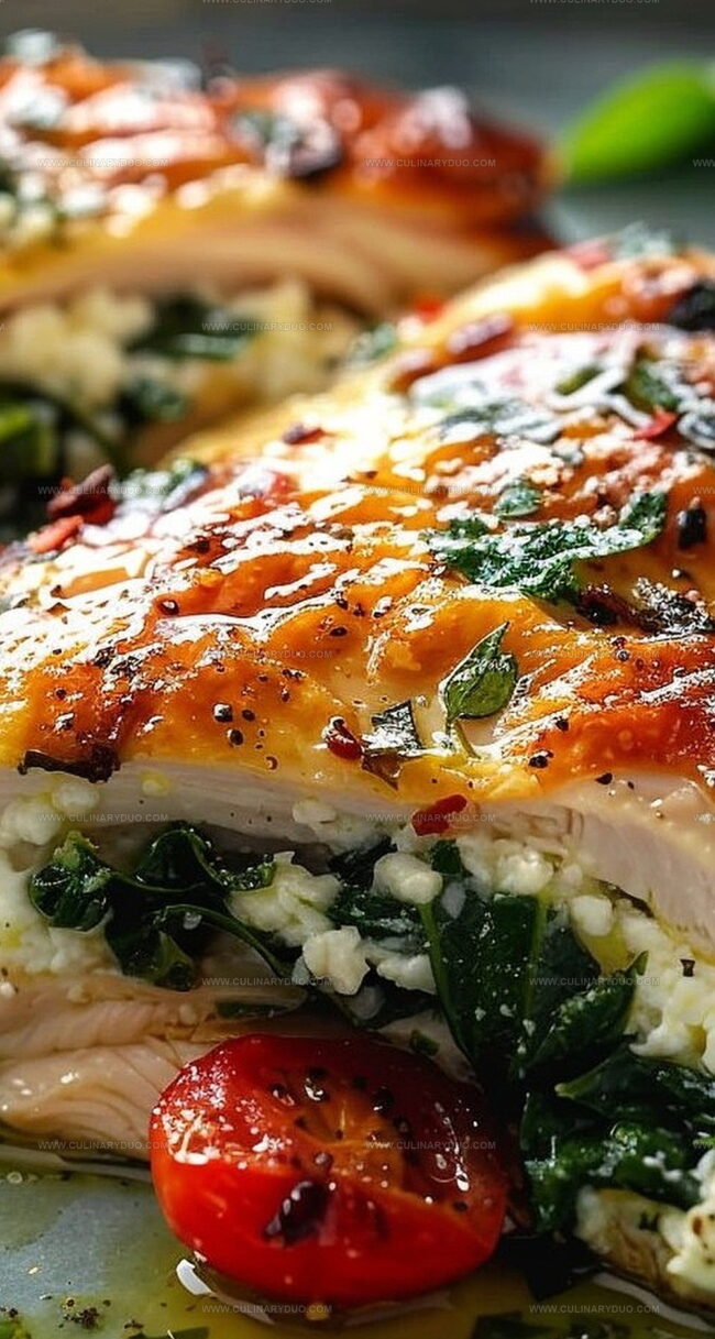 Succulent chicken breasts embrace classic Italian Spinach Ricotta Stuffed Chicken with creamy cheese and earthy greens nestled inside perfectly seasoned meat. Crisp golden exterior and tender interior promise a delightful meal you’ll savor with each delectable bite.