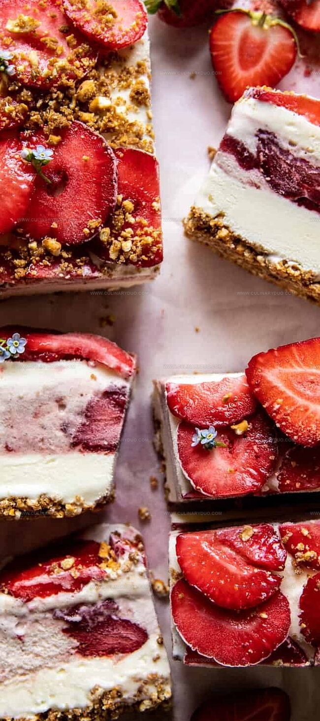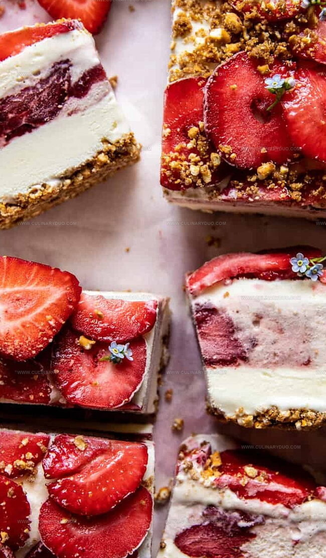 - Gently combine strawberry ice cream with strawberry jam, creating a marbled effect. Carefully spread this mixture over the vanilla layer, maintaining a consistent thickness. Freeze for an additional 30 minutes to solidify.
