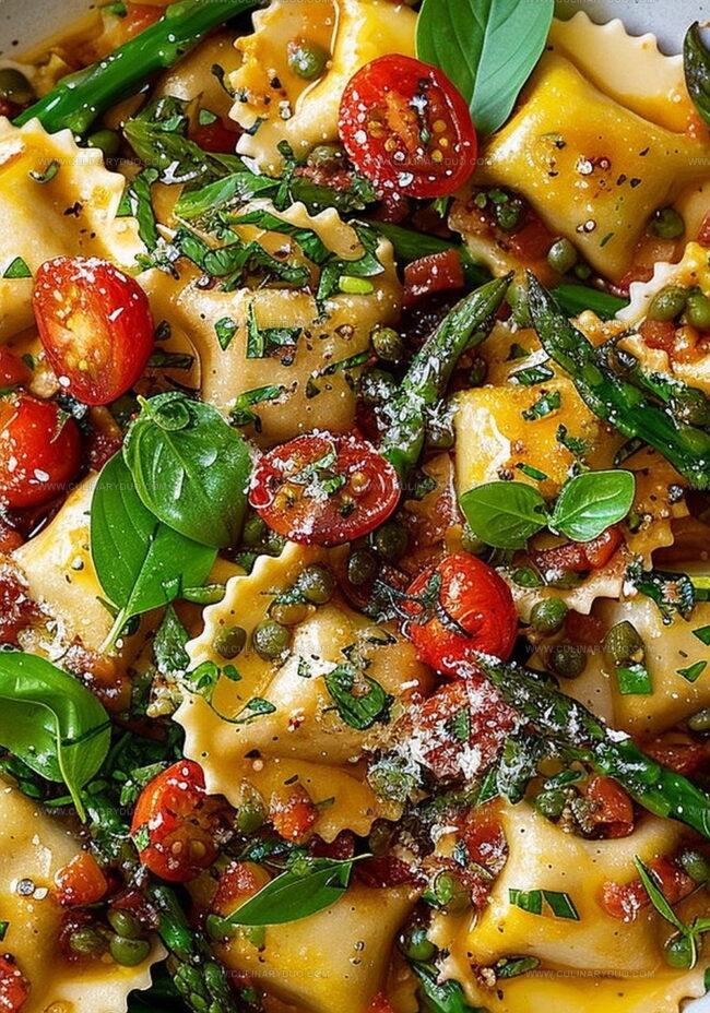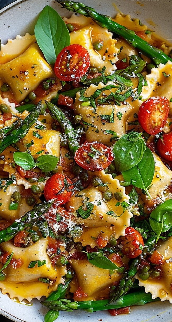 Mediterranean magic unfolds in this sun-kissed ravioli, blending fresh asparagus, ripe tomatoes, and fragrant herbs. Each delicate pasta pocket promises a symphony of flavors that transport you straight to Italy’s sun-drenched landscapes.
