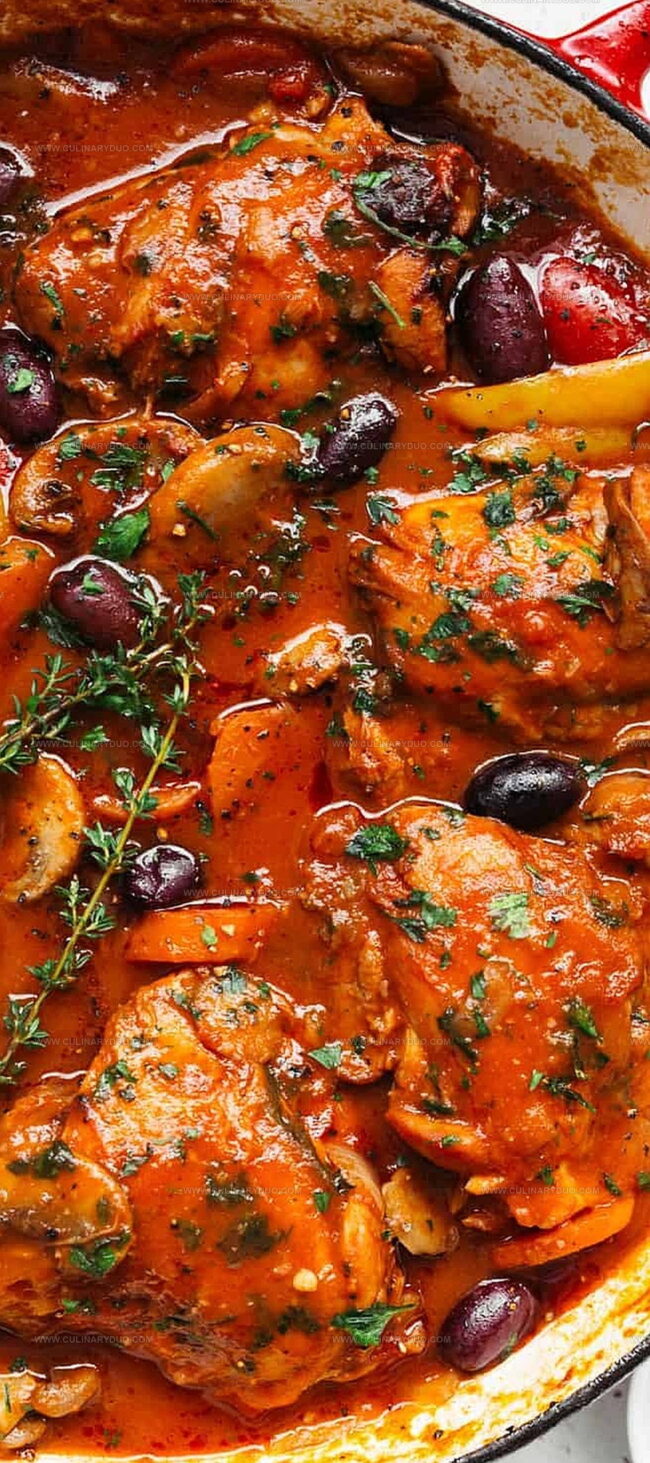 The combination of wine, herbs, fresh tomatoes, and slow cooking allows ingredients to develop deep, rich flavors while tenderizing the chicken.