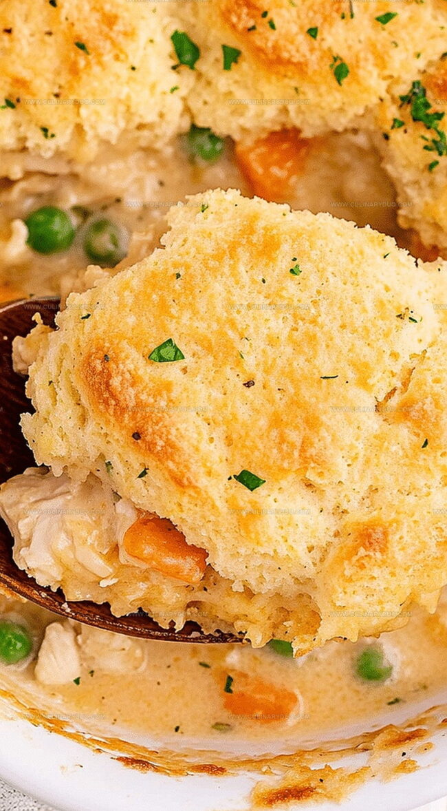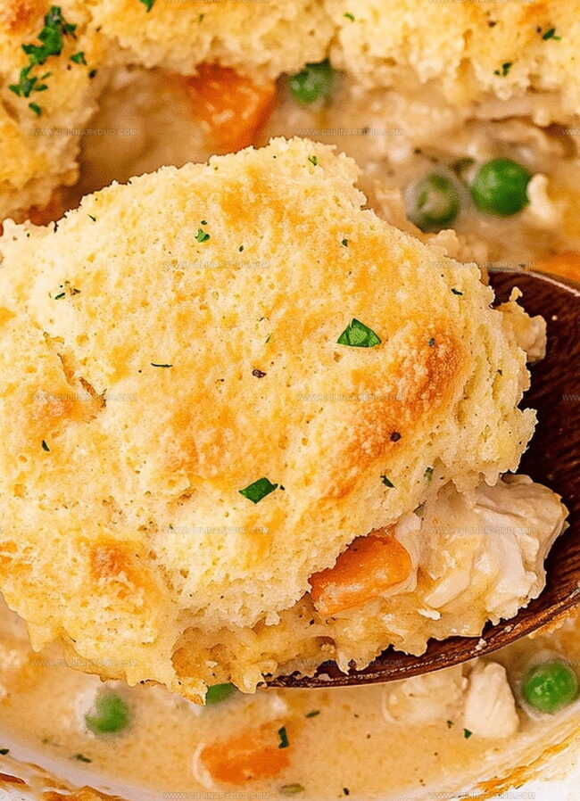 - Slice and serve warm, enjoying the comforting blend of tender chicken, vegetables, and cheesy biscuit topping.