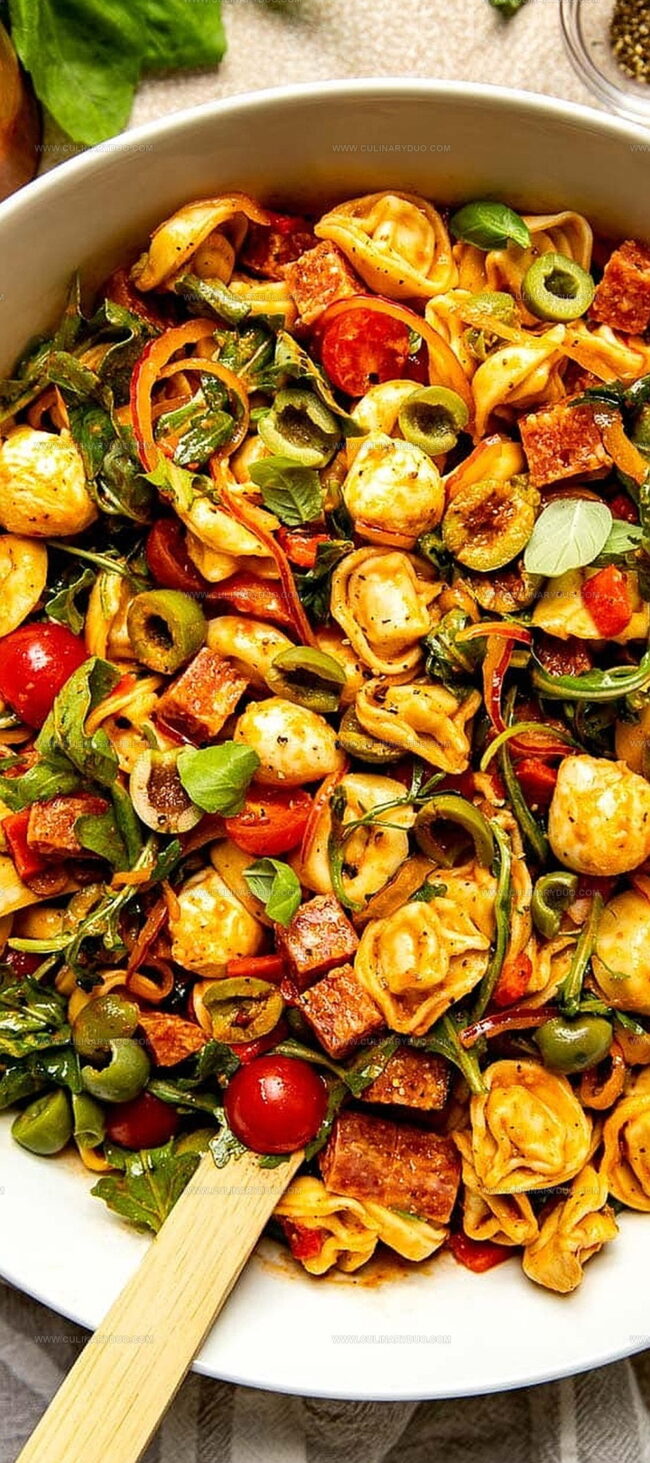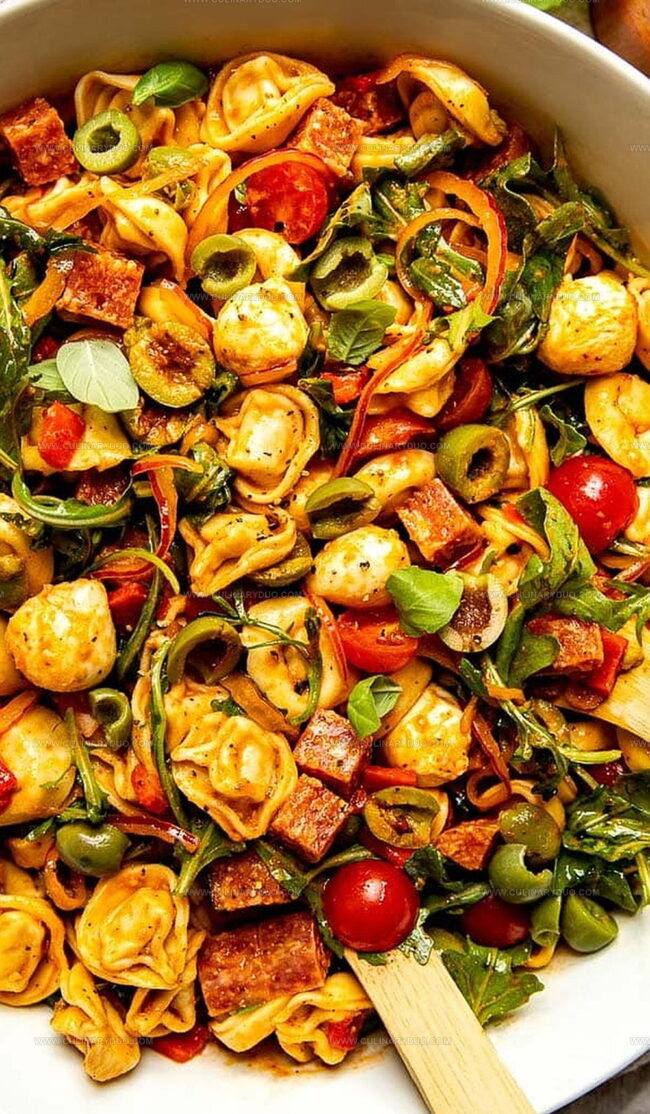 - In a spacious mixing bowl, combine cooled tortellini with diced red onion, roasted bell peppers, halved cherry tomatoes, sliced olives, chopped salami, and cubed mozzarella.