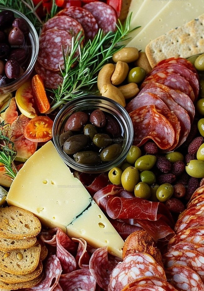 Succulent Mediterranean charcuterie board showcases an artful blend of cured meats, artisan cheeses, and fresh accompaniments. Delightful flavors and textures invite you to savor each carefully curated bite of this irresistible culinary canvas.